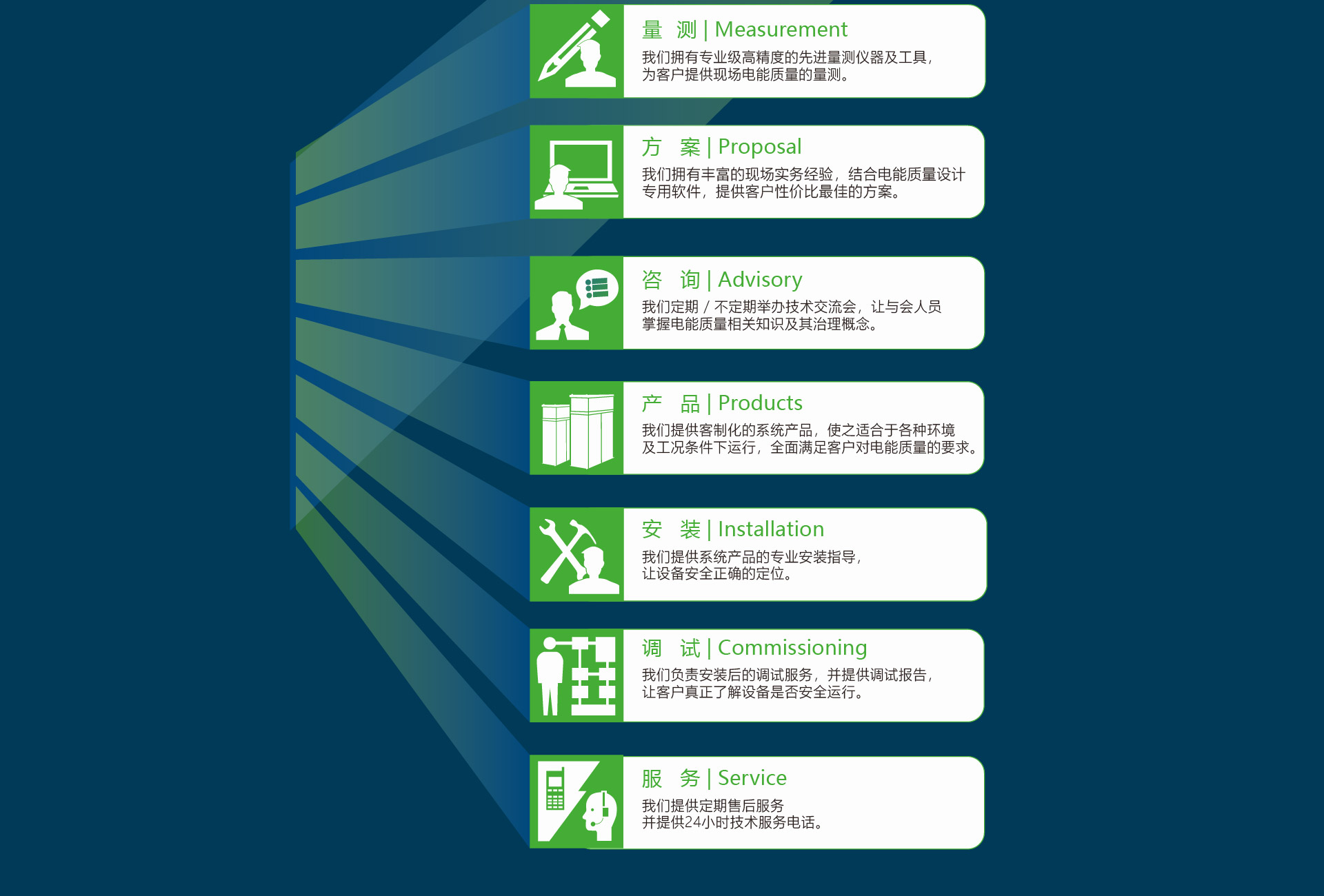 我们的产品中注入了NCS 逾35年的技术积累和开发经验,并不断致力于新技术的提升,精益求精。NCS不仅提供优质的无功补偿, 三相不平衡改善,电压暂降防止及谐波滤波器系统产品, 更长于提供全方位的解决方案,在电能质量改善及节能减排议题上,发挥优势,服务于客户得全方位需求。