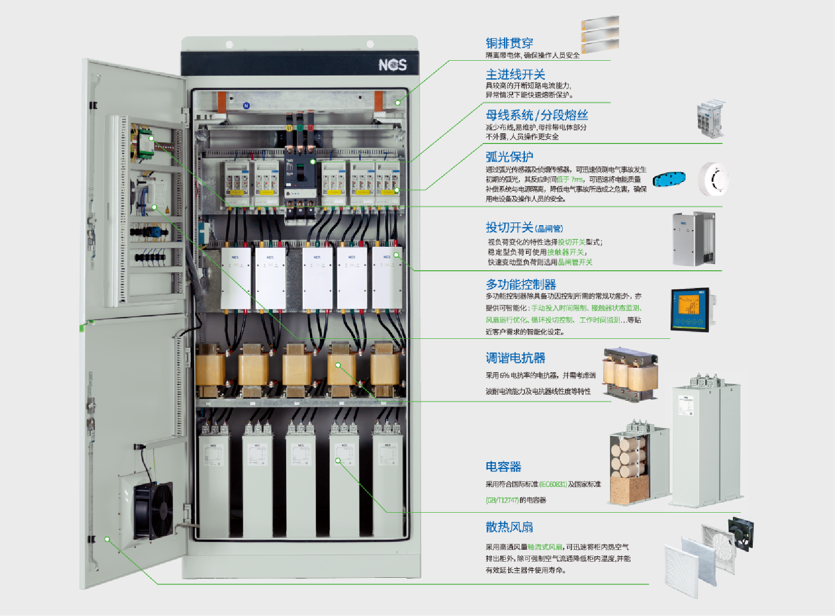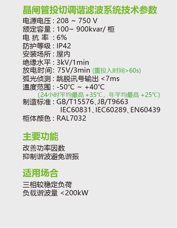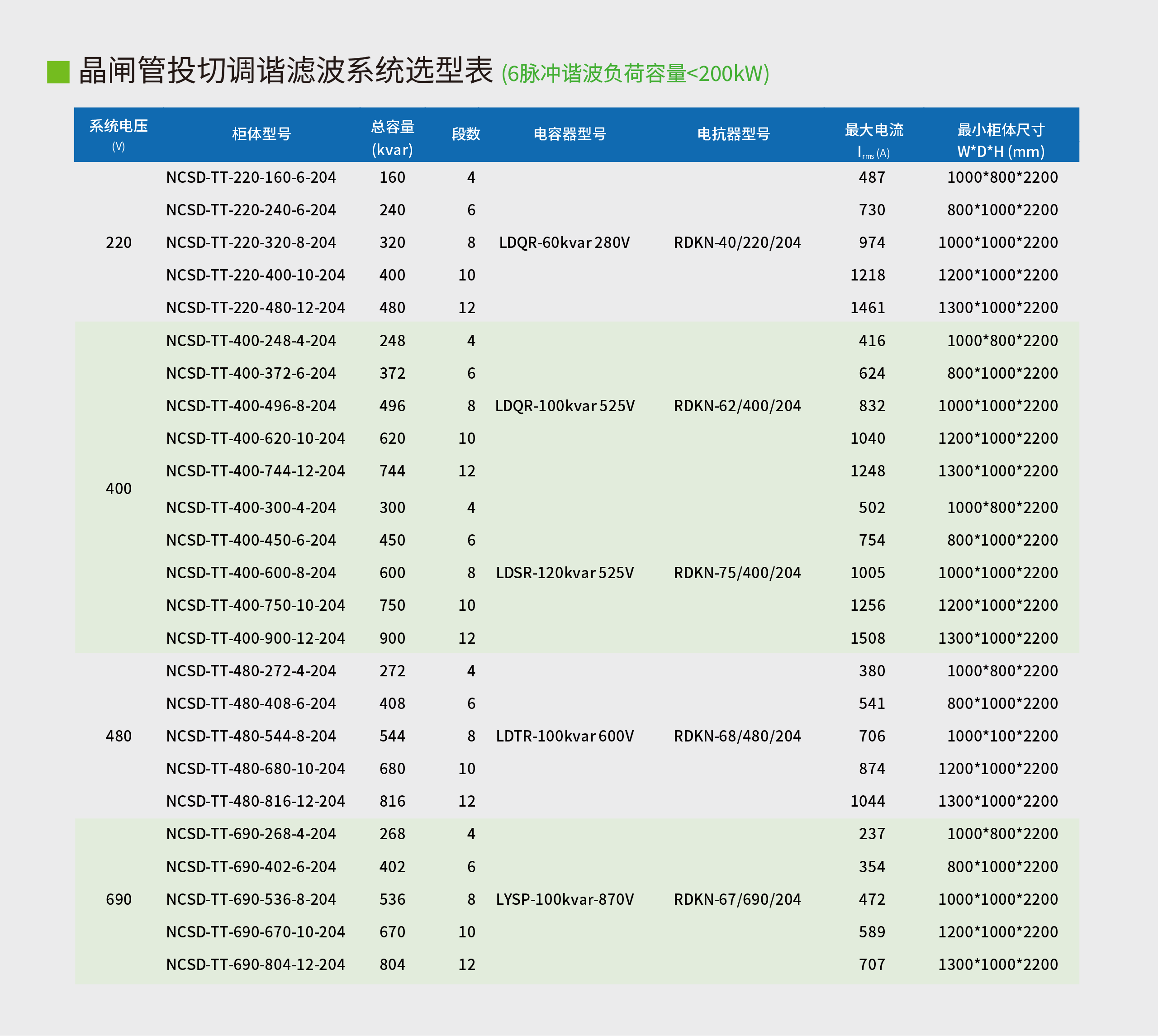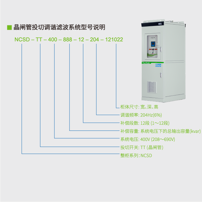 功能特点Main Component技术参数规格型号测试认证下载NCSD-TT低压晶闸管投切调谐滤波系统功能特点负荷变化快的大功率设备,例如点焊机、碎石机等,会引起配电网电压频繁跌落,晶闸管投切调谐滤波器可以最大限度抑制这种现象,达到稳定电网电压,以减少设备能量消耗,提高生产效率,延长设备使用寿命。主要功能避免串联谐振避免并联谐振改善功率因数过零投切快速补偿主要组成主进线保护母线系统电磁接触器晶闸管投切开关低压调谐电抗器低压电容器弧光保护系统晶闸管投切控制系统自动功因调节器(APFR)Main Component技术参数规格型号测试认证