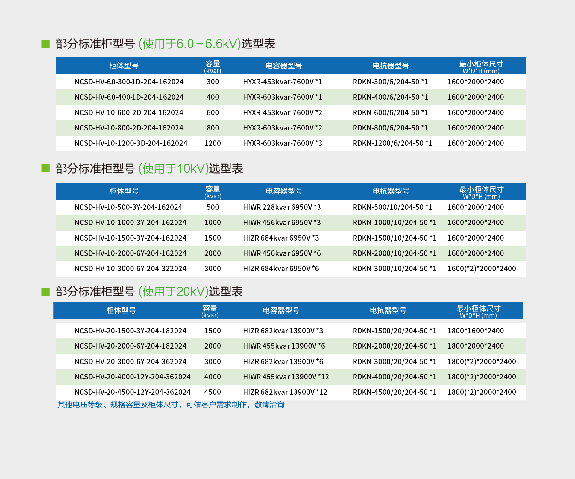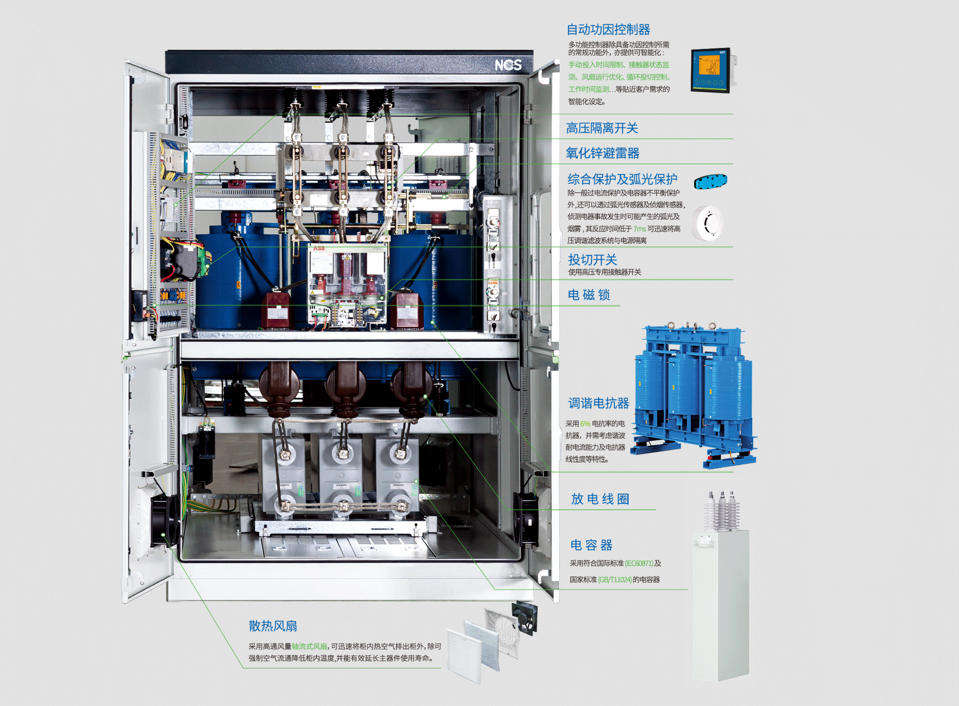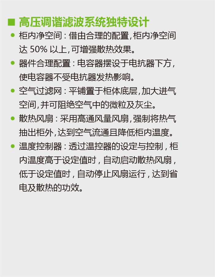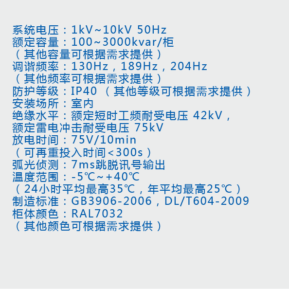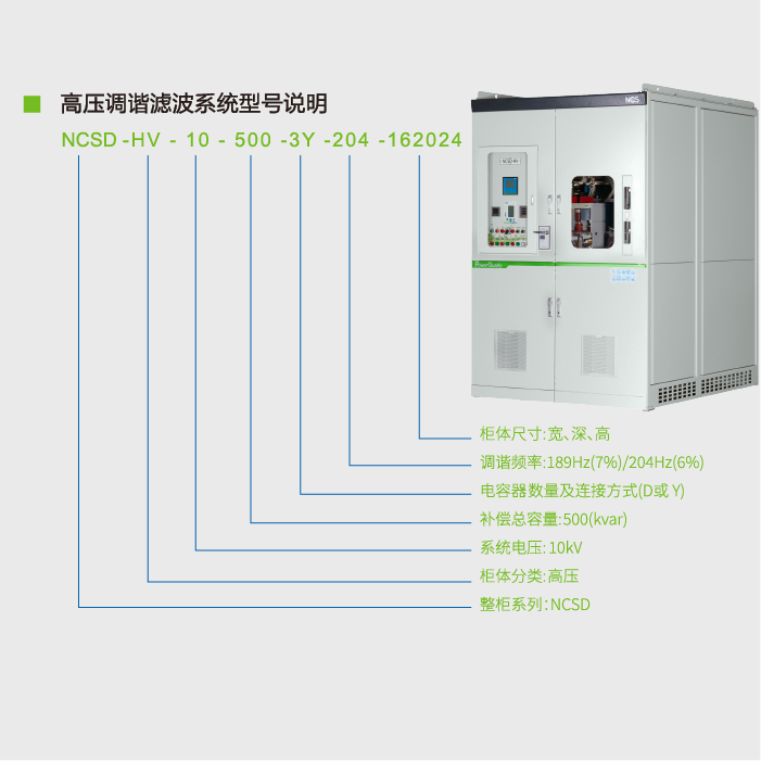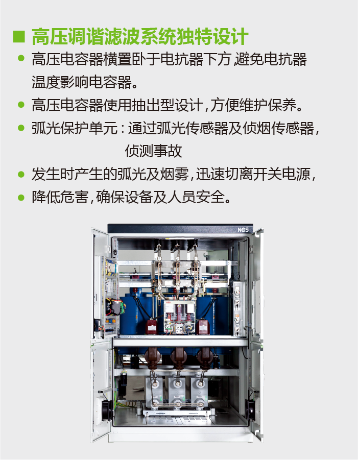 功能特点Main Component技术参数规格型号测试认证下载NCSD-HV高压调谐滤波器功能特点当高压电网中存在少量谐波时,适合用调谐滤波系统做无功补偿,此系统主要由电容器和电抗器串联组成,如此可以避免谐振现象的发生,不但不会放大谐波,并可滤除部分谐波,同时改善功率因数。主要功能避免串联谐振避免并联谐振改善功率因数主要组成高压隔离开关真空接触器氧化锌避雷器放电线圈高压调谐电抗器高压电容器弧光保护系统抽出式结构设计Main Component技术参数规格型号测试认证