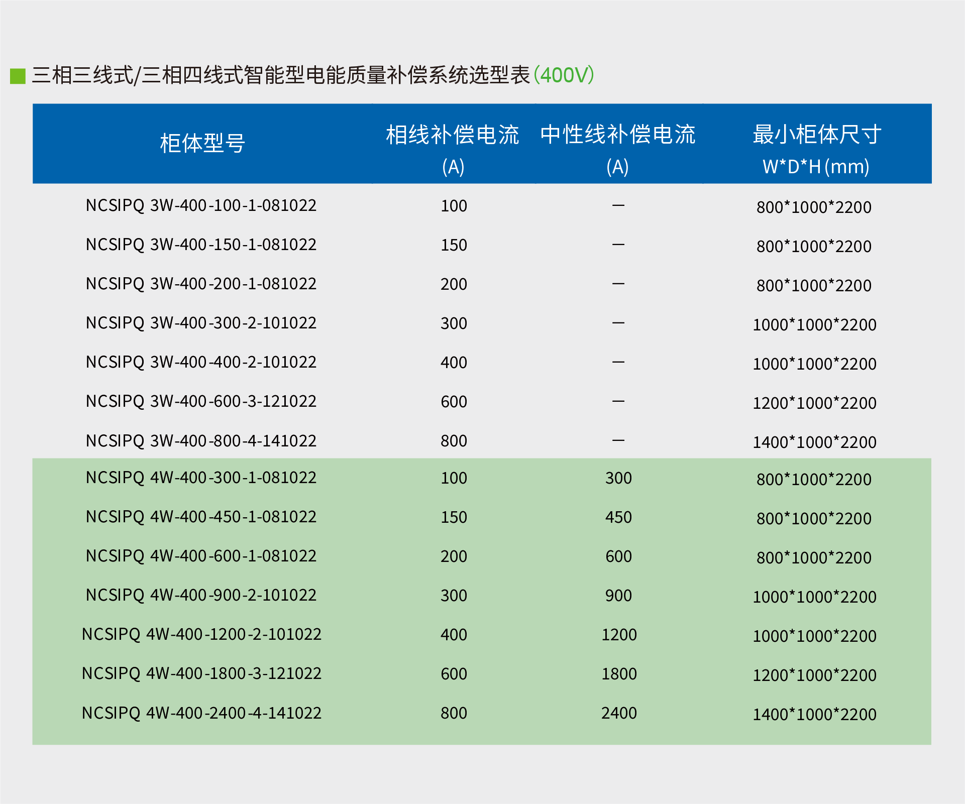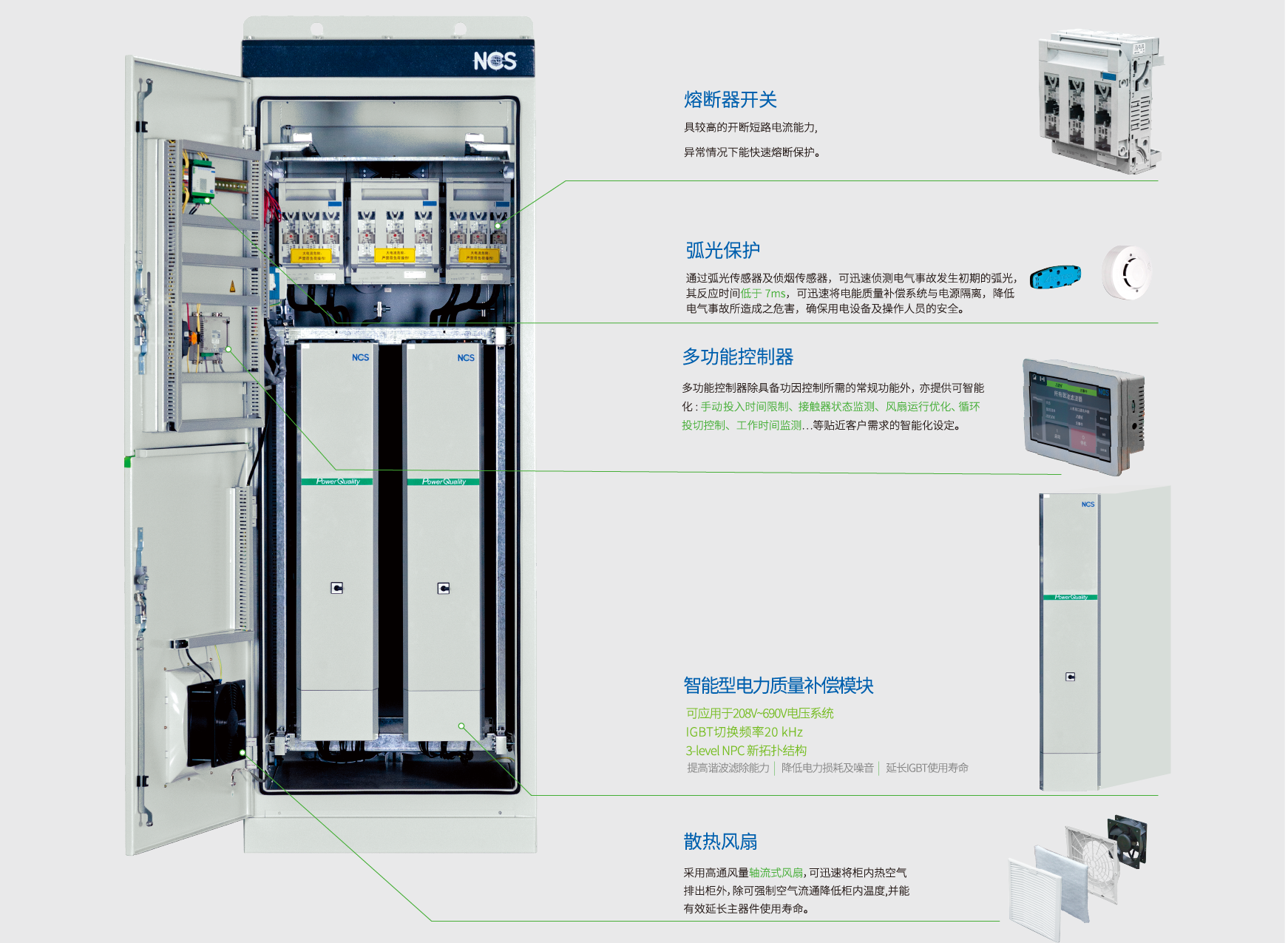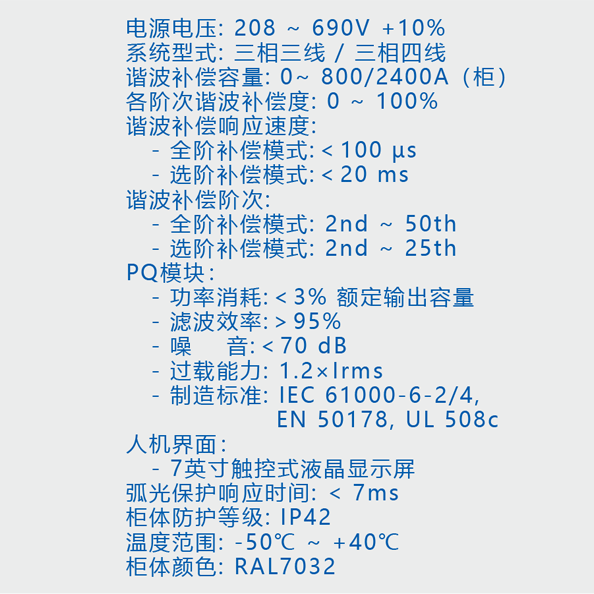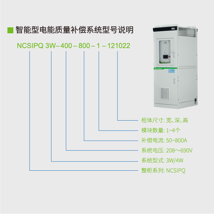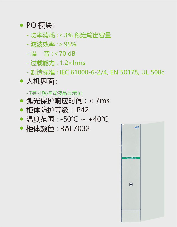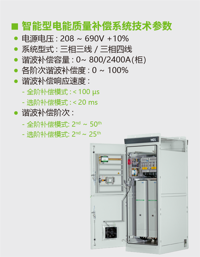 功能特点Main Component技术参数规格型号测试认证下载NCSIPQ智能型电能质量补偿系统功能特点智能型电能补偿系统(NCSIPQ),一机解决无功补偿与电能质量需求,结构紧凑,节省占地空间。NCSIPQ可同时满足谐波滤除(APF)、功率因数改善(SVG)、稳定电压、平衡负载电流(AUC)等功能。主要功能快速滤波与功因补偿无段功因补偿电压闪变改善可改善间谐波电流改善中性线零序谐波电流补偿三相非对称功率因数平衡三相不平衡负载电流改善系统电压不平衡响应速度<1ms主要组成主进线保护电能质量模块(PQ)人机界面(HMI)弧光保护系统Main Component技术参数规格型号测试认证